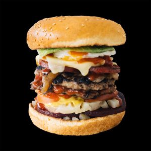 Double Angus beef patty, Sujuk (Beef Salami), melted aged tasty cheese, egg, tomato, baby cos lettuce, pickles, beetroot, pineapple and caramelised onion with mustard and tomato sauce on a toasted brioche bun