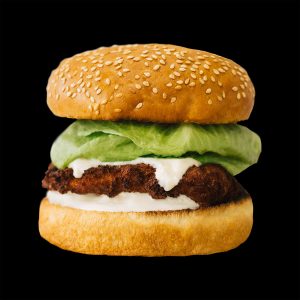 A blended veggie patty, vegan mayo, fried cauliflower and baby cos lettuce with tomato relish on a toasted brioche bun