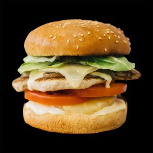 Chargrilled chicken breast fillet, melted aged cheese, pineapple, tomato, lettuce and caramelised onion with mild-peri mayo on a toasted brioche bun